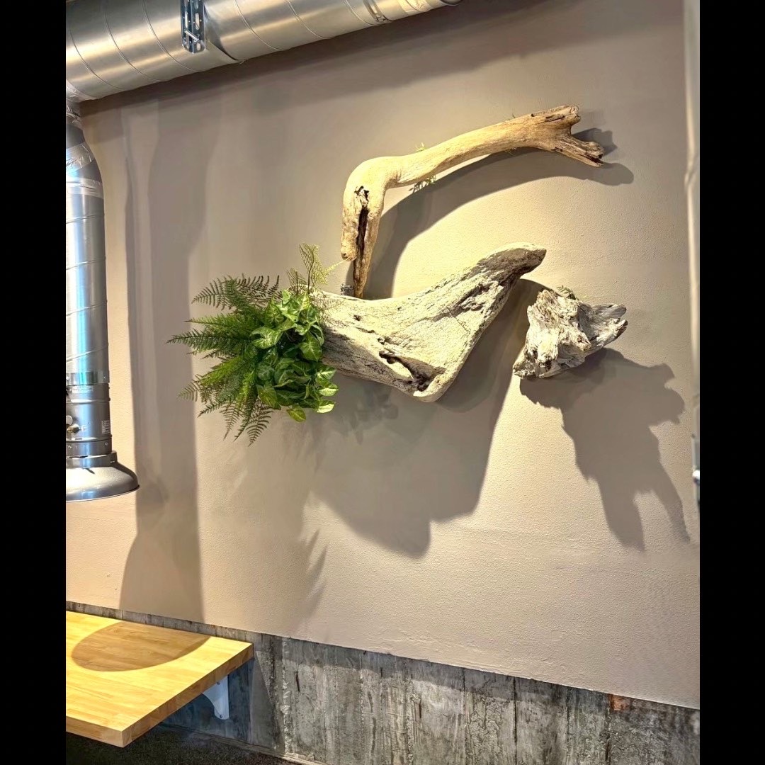 フェイクグリーンを用いた壁面装飾、流木アート、