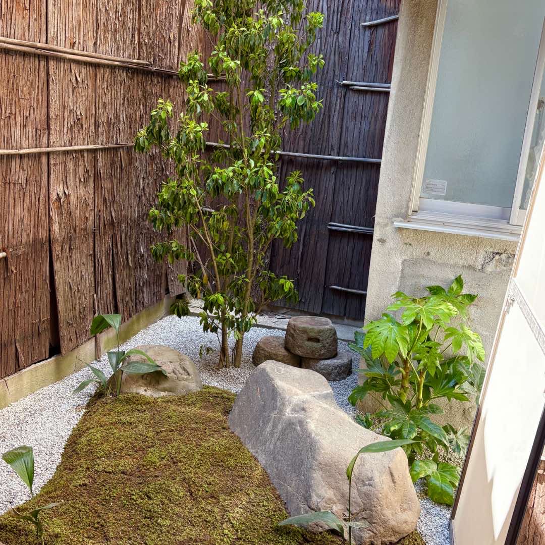 屋外の中庭には、生木と苔をあしらい、和を感じられる本格的な坪庭をデザインいたしました。